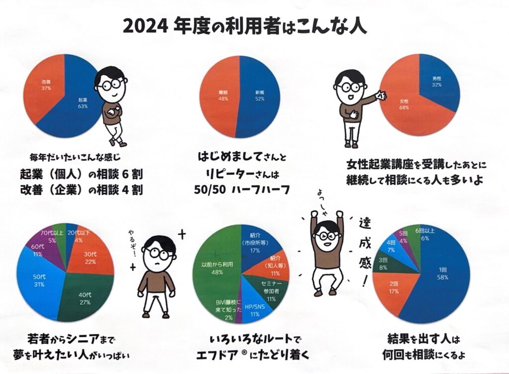 毎年だいたい起業(個人)の相談の方が6割、改善(企業)が4割です。新規の方とリピーターは5割ずつ程でおなじくらい見えます。若い世代の方からシニアの方まで、様々な年代の方にお越しいただいています。