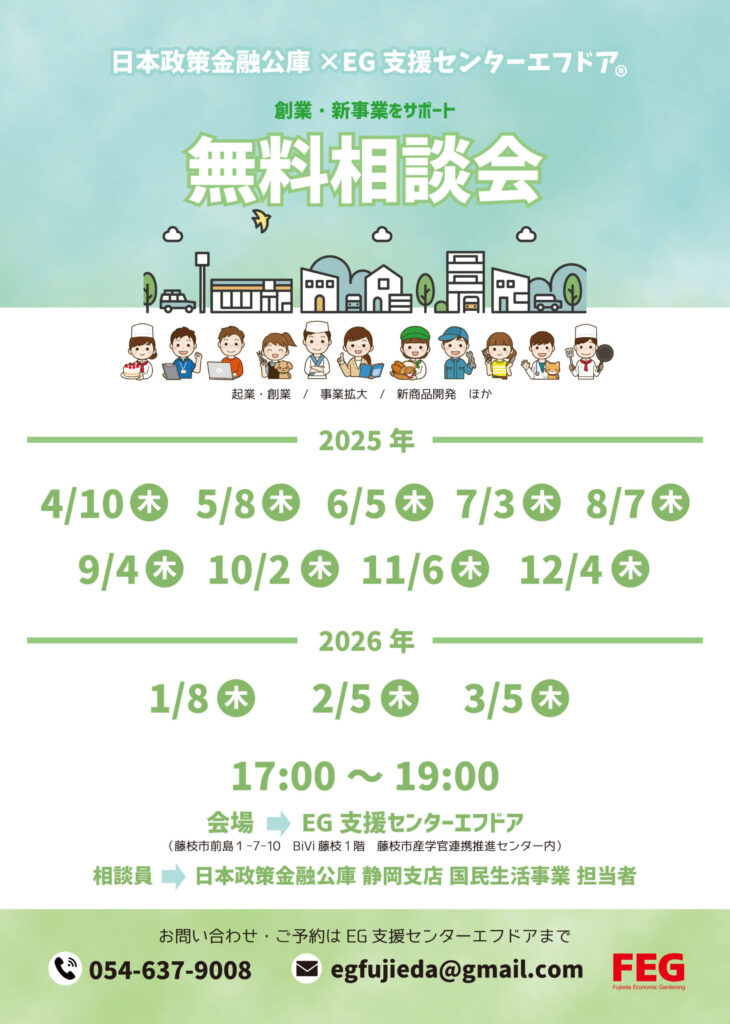 エフドア®では毎月1回、日本政策金融公庫 静岡支店の担当者に来ていただき、融資や事業計画書作成に関する相談日を設けています。相談は無料です。(※完全予約制)